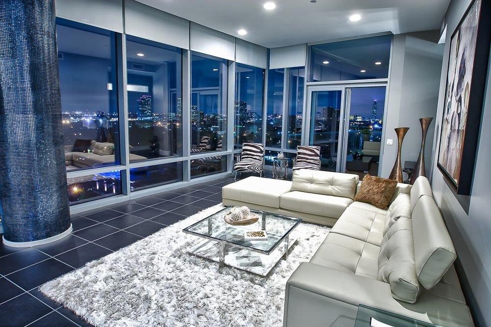 Dark Floor Gray Wall Living Room Contemporary with city viewDark Floor Gray Wall,White Couch,Dark Tile Floor,Tile Column,Designer Couches,Curved Walls,Silver Rug,Sexy Sofa,City View,Shaggy Rug,Shaggy Carpet,Black Tile Wall,Pearl White,High-rise,City Skyline Wall Decals,Mosaic Tile Supporting Column,High Rise Windows,Shaggy Pillows,Mosaic Carpet,Persian Rug Mosaic