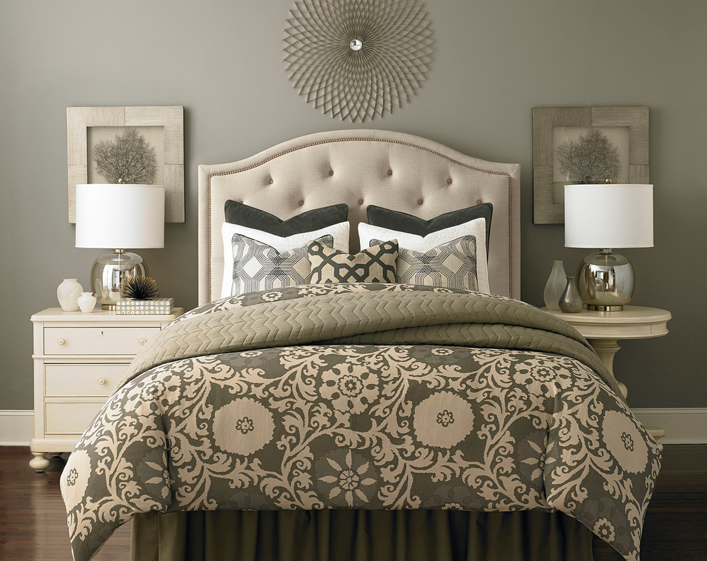 Mismatched Nightstand Bedroom Contemporary with Family Room Paint Colors,Bedroom Decoration,Greige Walls,Mismatched Nightstand,Mirror Above Bed,Bassett Furniture,Mismatched End Tables,Greige And Green,Custom Upholstered Bed,Bedroom Pop Of Color,Heywood Wakefield Furniture,Pictures Behind Lamps,Greige Bedroom,Mismatched Bedding,Starburst Mirror