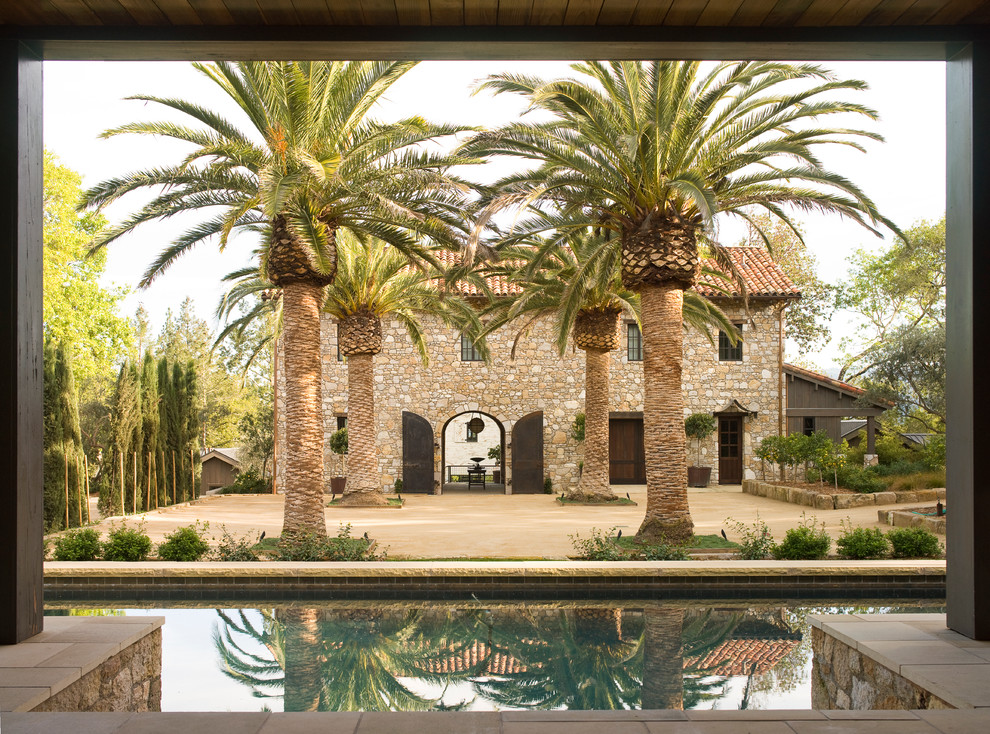 Tree In Courtyard Exterior Mediterranean with archwayBackyard Pool Landscaping Idea,Waterline Tile,Clay Color,Gutter,Trees In Pots,Palm Pots,Rock Siding,Queen Size Bed,Rain Gutter,Tree In Courtyard,Queen Size Bunk Bed,Clay Tile Roof,Pool Waterline Tile,Potted Palm Tree,Citrus Tree,Grey Liner Swimming Pool,Potted Trees,Wood Lintel,Lintel,Large Exterior Planter Box